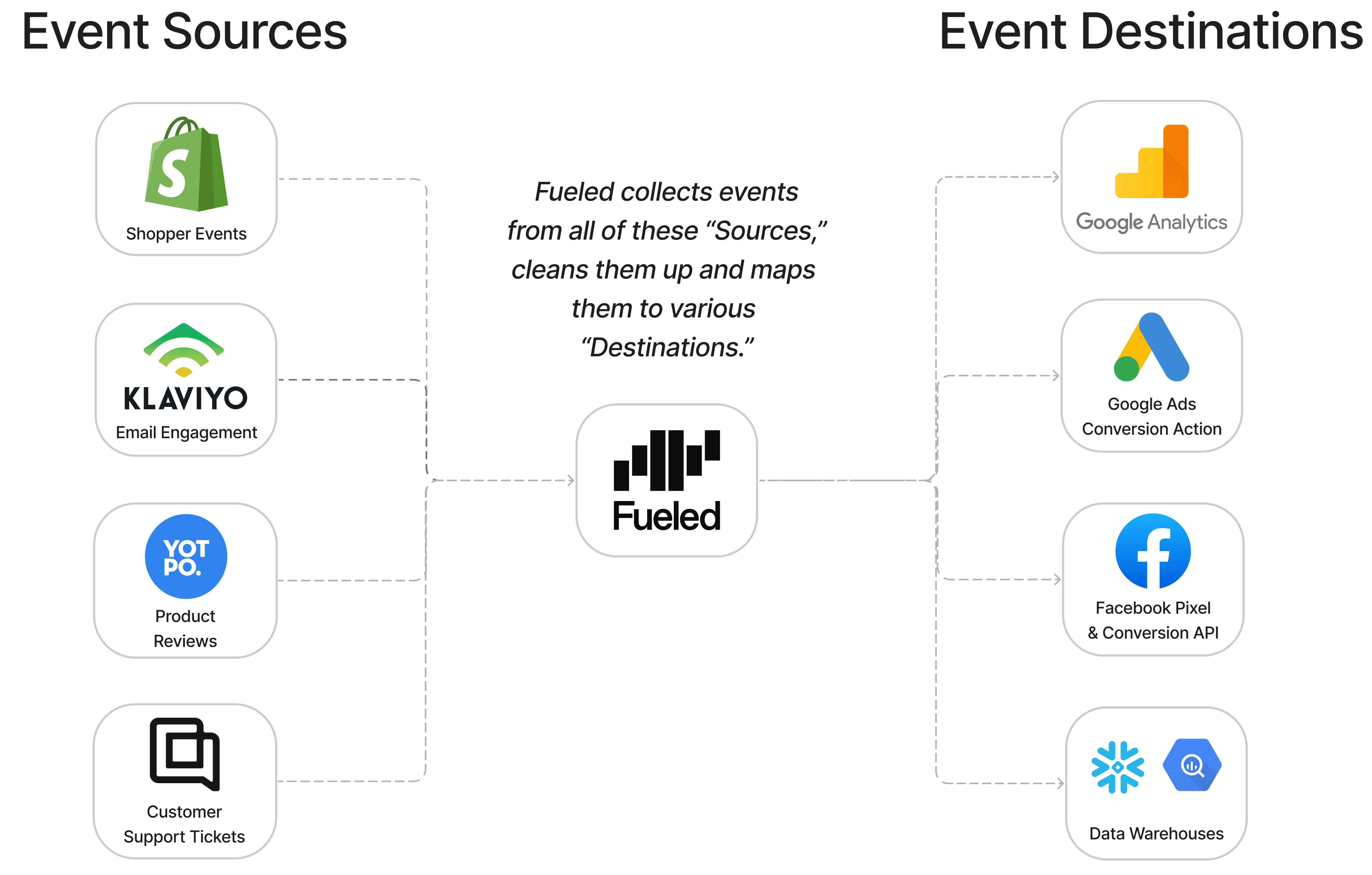 Once Fueled receives event data from a Source, this data is cleaned and transformed, so that it can be sent to each integrated Destination, in the format that that Destination requires. A purchase event, for example, is transformed into different data formats for Destinations such as Google Analytics, Facebook Conversion API, or Klaviyo.